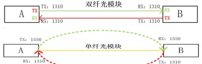 对于双纤光模块的配对规则必须传输距离一致,接口速率一致,模式一致以及纤数一致,这样光模块才能正常工作。而对于单纤的光模块要满足以上条件外,还需要波长匹配。因为光模块进行传输数据时分为发送和接收两个方向,双纤光模块通过不同的端口区分,单纤光模块通过不同的光波长区分。因此在使用单纤的光模块时,两端光模块的波长要匹配,即TX/RX相反。如下: