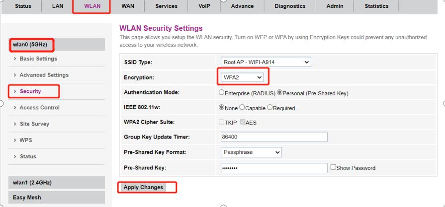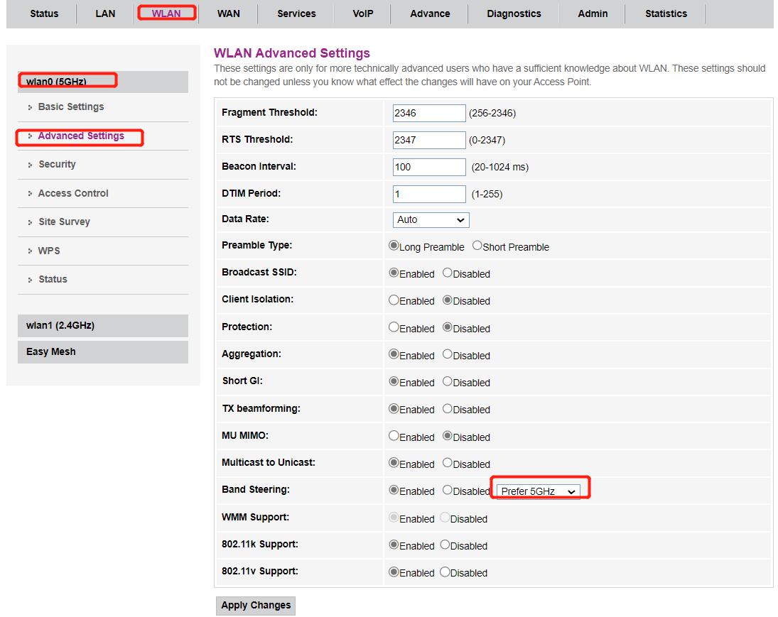 启用波段转向通过勾选”Enabled on Band Steering”和选择在wlan0标签上的”Prefer 5GHz”,如下: