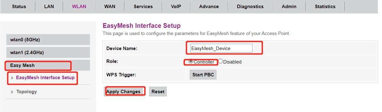 配置好wlan后,点击Easy mesh,把该AP设备作为easymesh网络中的Controller,配置如下: